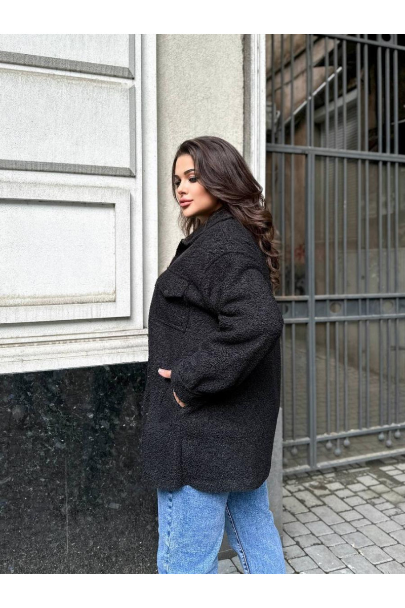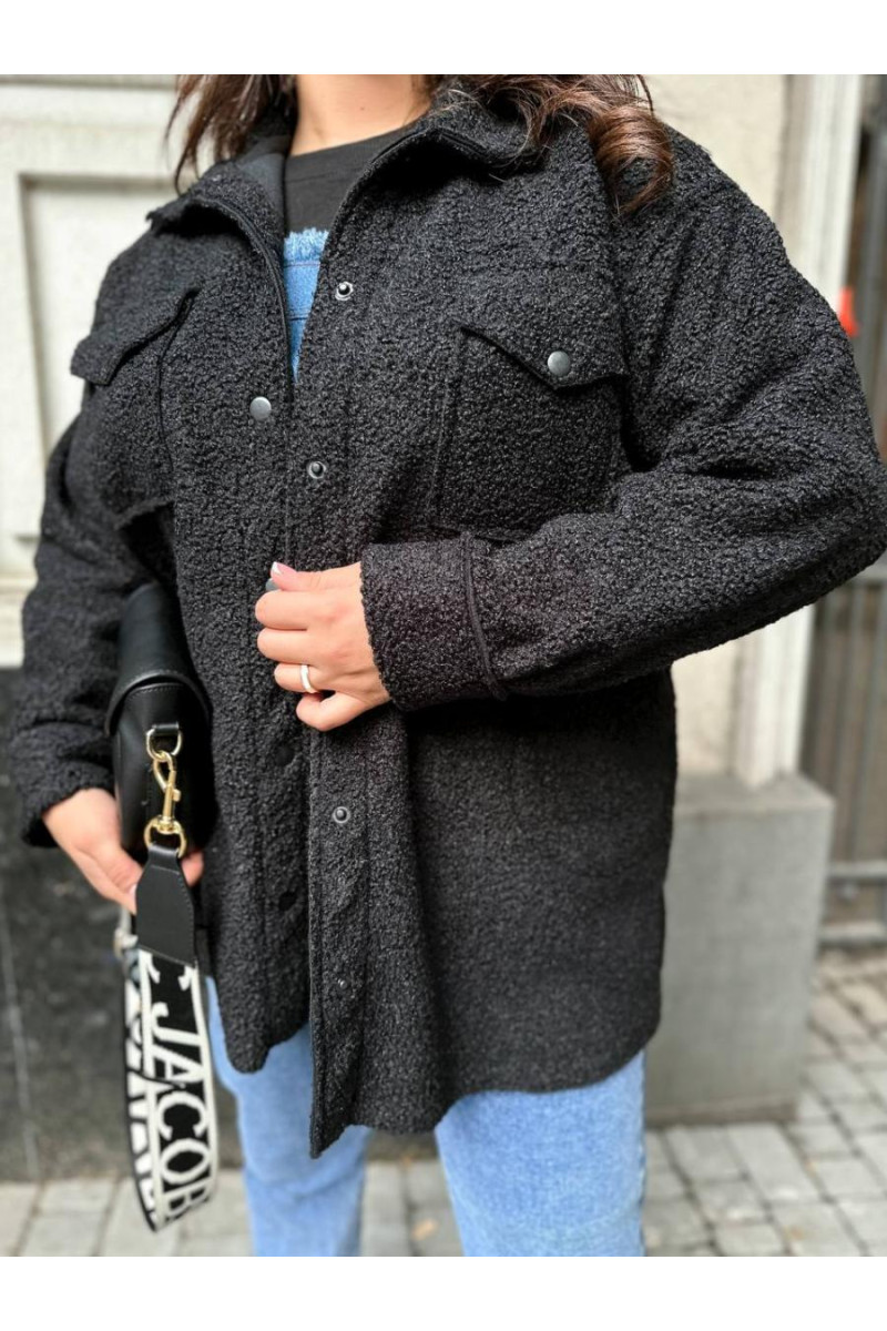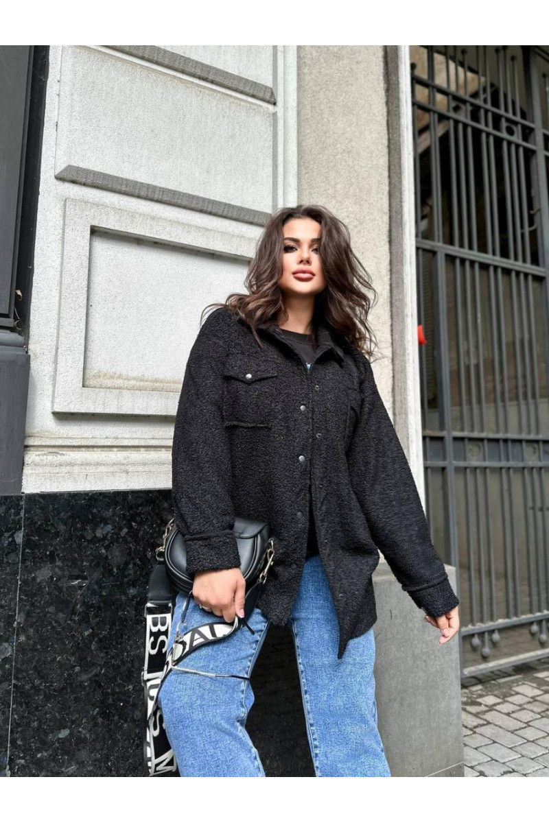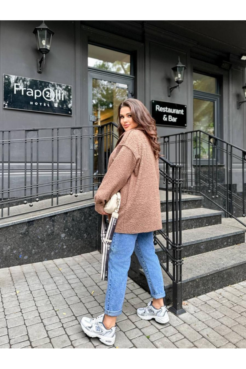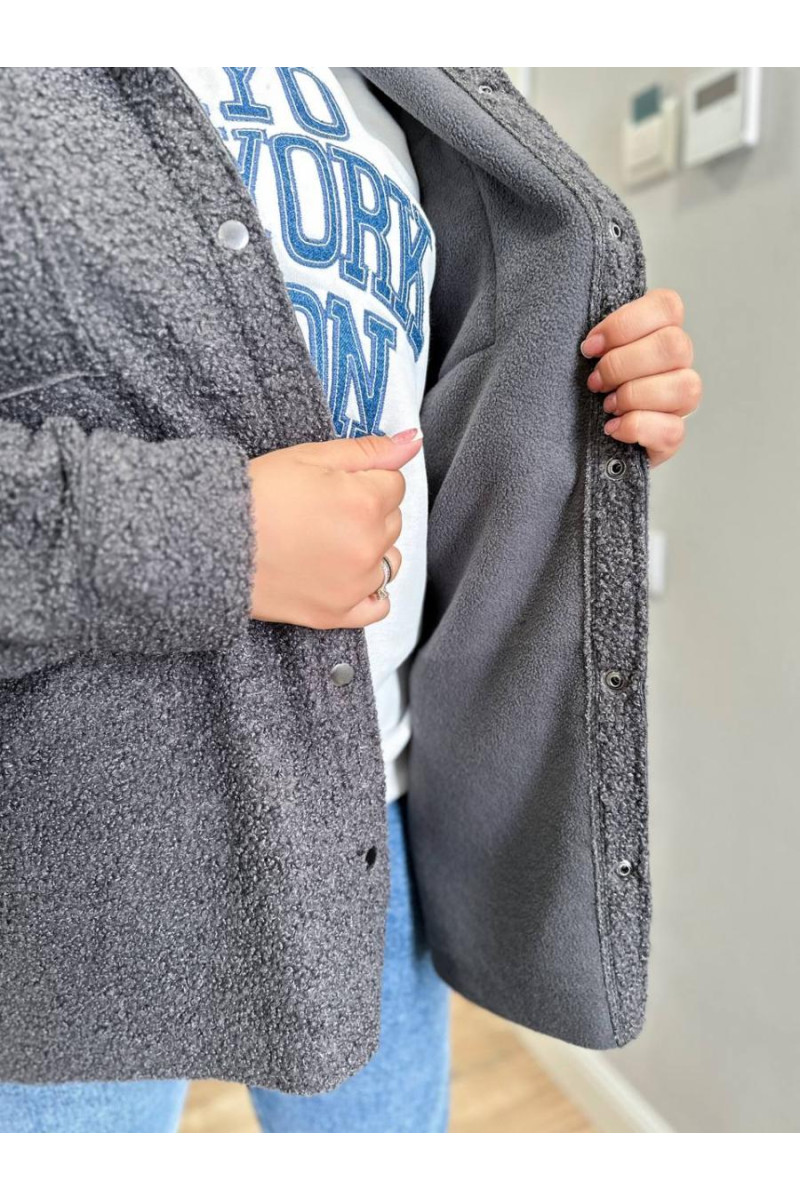 Пальто-сорочка із дуже якісного , теплого та приємного на дотик барашку на флісі з комірцем . Застібка — кнопка в колір , бокові прошиті кишені , гарна обробка країв виробу , повномірні .