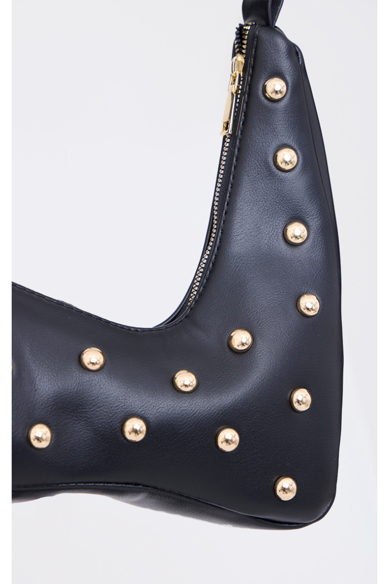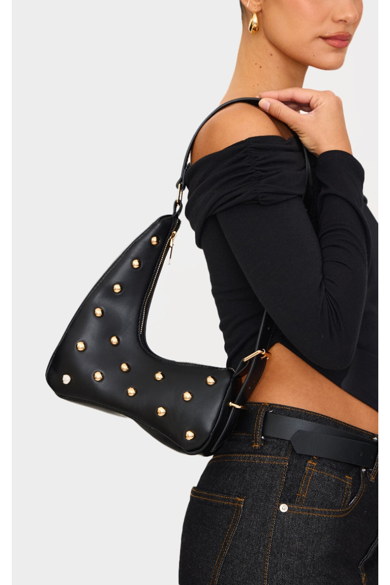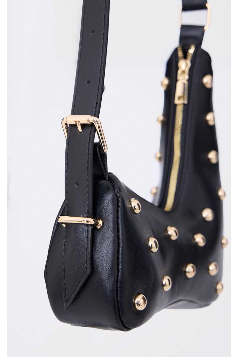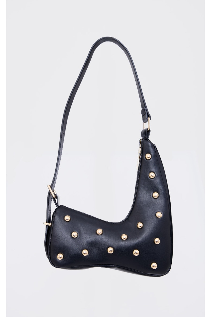 Миттєво доповніть свій вихідний образ цією чорною сумкою через плече з поліуретановим золотом і абстрактними деталями. Виготовлений із чорного поліуретанового матеріалу з абстрактним дизайном і шипованими деталями, як ви можете встояти? Просто додайте цю сумку через плече до ефектного вбрання, щоб створити шикарний завершальний штрих. Приблизна висота: 9 см/3,5 дюйма Приблизна ширина: 19 см/7,5 дюйма Приблизна глибина: 4 см/1,5 дюйма Категорія: АксесуариТип продукту: Сумка на плечеКолір: ЧорнийВипадок: День