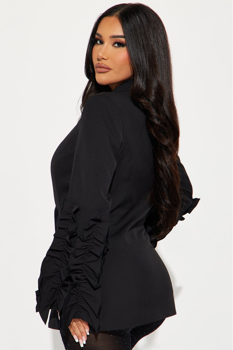 Елегантний блейзер з ефектом запаху та оригінальними рукавами з рюшами. Цей вишуканий виріб чудово підкреслить ваш стиль. Основна тканина: 97% поліестер, 3% спандекс. Підкладка: 95% поліестер, 5% спандекс. Імпортний виріб.